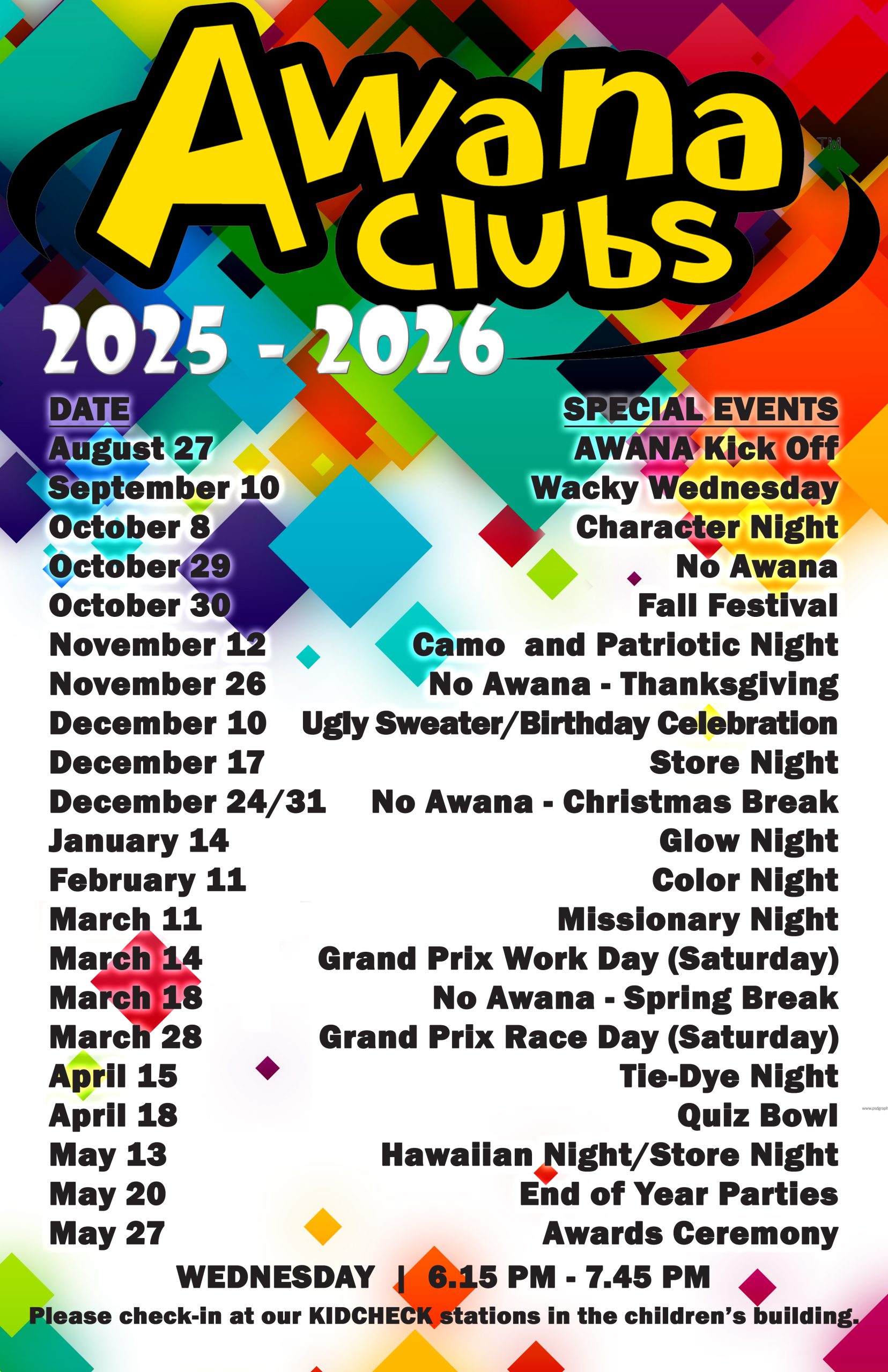 Our clubs meet on Wednesday nights during the traditional school year from 6.15 to 7.45 pm. Check-in begins at 6 pm. There is game time, handbook time, and counsel time.